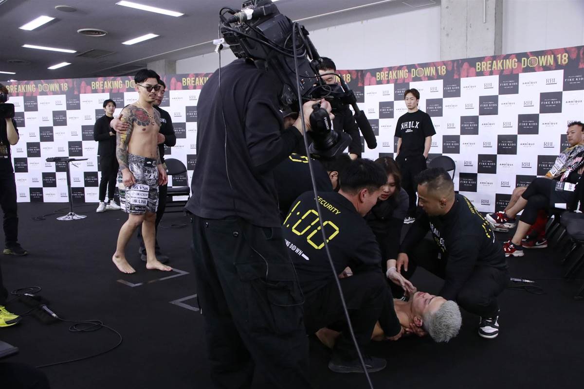 2025年12月13日、さいたまスーパーアリーナで行われた『BreakingDown 18』の前日公開計量と記者会見で、ライト級ワンマッチに臨む江口響と竜がフェイスオフで激しくにらみ合いました。その際、江口が突如竜にビンタを見舞い、竜は昏倒し、脳震盪の可能性がある状態に。右足は痙攣し、動かなくなり、会場は緊急事態に陥りました。