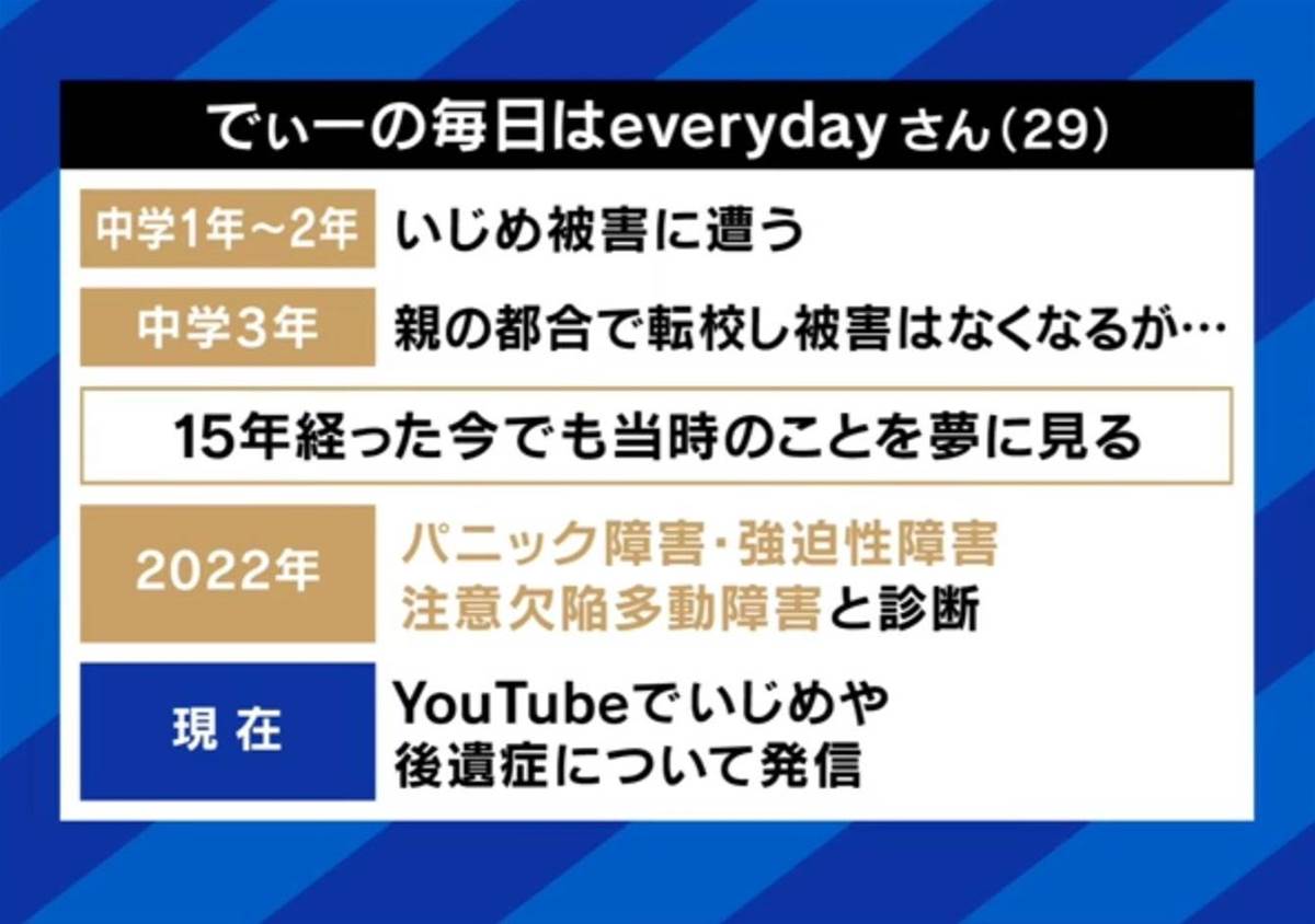 この事件は、「いじめ後遺症」に関するもので、過去に受けたいじめが原因で引き続き心的外傷に苦しむ人々について報じています。でぃーさんは中学2年生の頃に無視や悪口、身体的嫌がらせを受け、転校後も一生涯にわたって影響を受けています。症状は成人してから現れ始め、現在は脅迫性障害やパニック障害の診断を受けており、心療内科で治療を続けています。