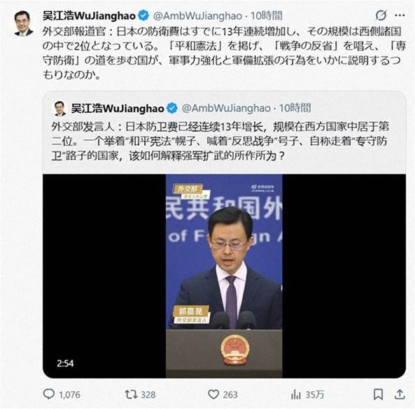 中国の呉江浩駐日大使が、SNS上で中国外交部報道官のコメントを引用し、日本の防衛費の増加に関する批判を展開しました。日本は「平和憲法」や「専守防衛」を掲げながら、13年連続で防衛費を増加させ、西側諸国中で2位の規模に達していると指摘されています。高市早苗首相の台湾有事についての発言以降、日中関係は緊張状態にありますが、6日には沖縄本島南海上空で中国軍の戦闘機が自衛隊機にレーダーを照射する事件が発生しました。