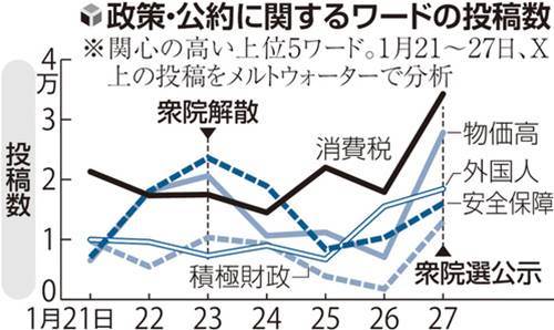 衆院選を巡るSNS上の関心が、特に「消費税」と「物価高」に集中していることが明らかになりました。この分析は読売新聞が米メルトウォーター社のSNS分析ツールを使用して行い、2月8日に行われる衆院選に関連する投稿を対象としました。1週間の期間(1月21日から27日)において、最も多く言及されたのは「消費税」で約3万4000件の投稿がありました。続いて「物価高」は約2万7000件、そして「外国人」についての投稿は1万件前後で推移しています。これらのテーマに対する各党の公約への賛否がSNSで活発に議論されていますが、与党が掲げる「議員定数」や「副首都」については数千件と比較的関心が低い状況です。