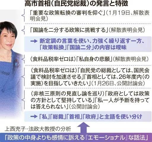 事件概要:高市早苗首相は衆院選前後に「政策の大転換」「国論を二分」など響きの強い言葉を使い、印象操作を試みる姿勢が目立った。一方で具体的な政策転換の中身や「国論を二分する政策」の真意について曖昧な説明に終始。防衛費増額や消費税減税などに関しても言葉に矛盾やブレが散見され、SNSや党内で困惑が広がっている。予算拡張や税収不足など緊縮財政とは言い難い実態の中、政権の方向性とその根拠が問われる状態となっている。