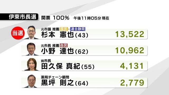 伊東市長選挙が行われ、元市議で国民民主党県連が推薦する杉本憲也氏が初当選を果たしました。当選を受けて杉本氏は、伊東市がこれまで変わらないと感じられていたことに対し、市民とともに変革を進める意向を示しました。一方、再選を目指した田久保前市長は、選挙後の夜に報道陣に対してコメントを行わず、数日中にSNSでコメントを発表する予定としています。