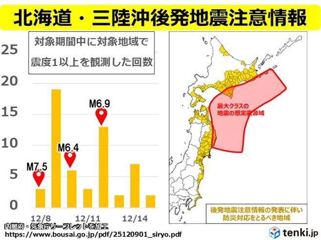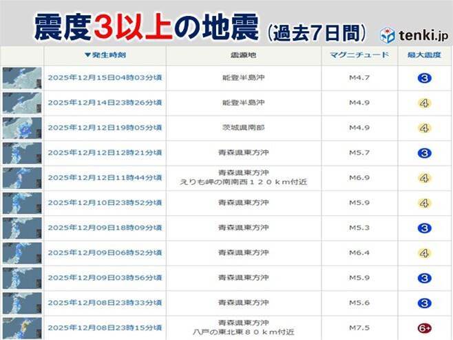 青森県東方沖で最大震度6強の地震が発生してから1週間が経ち、その後も北海道から三陸沖にかけて72回の地震が観測されている状況です。その中で、震度3以上は11回、震度4以上が6回発生しています。さらに、能登半島沖でも震度4の地震が発生しており、地震の警戒が必要な状態が続いています。気象庁は「北海道・三陸沖後発地震注意情報」を発表し、特定の地域には防災対応をとるべきとしています。