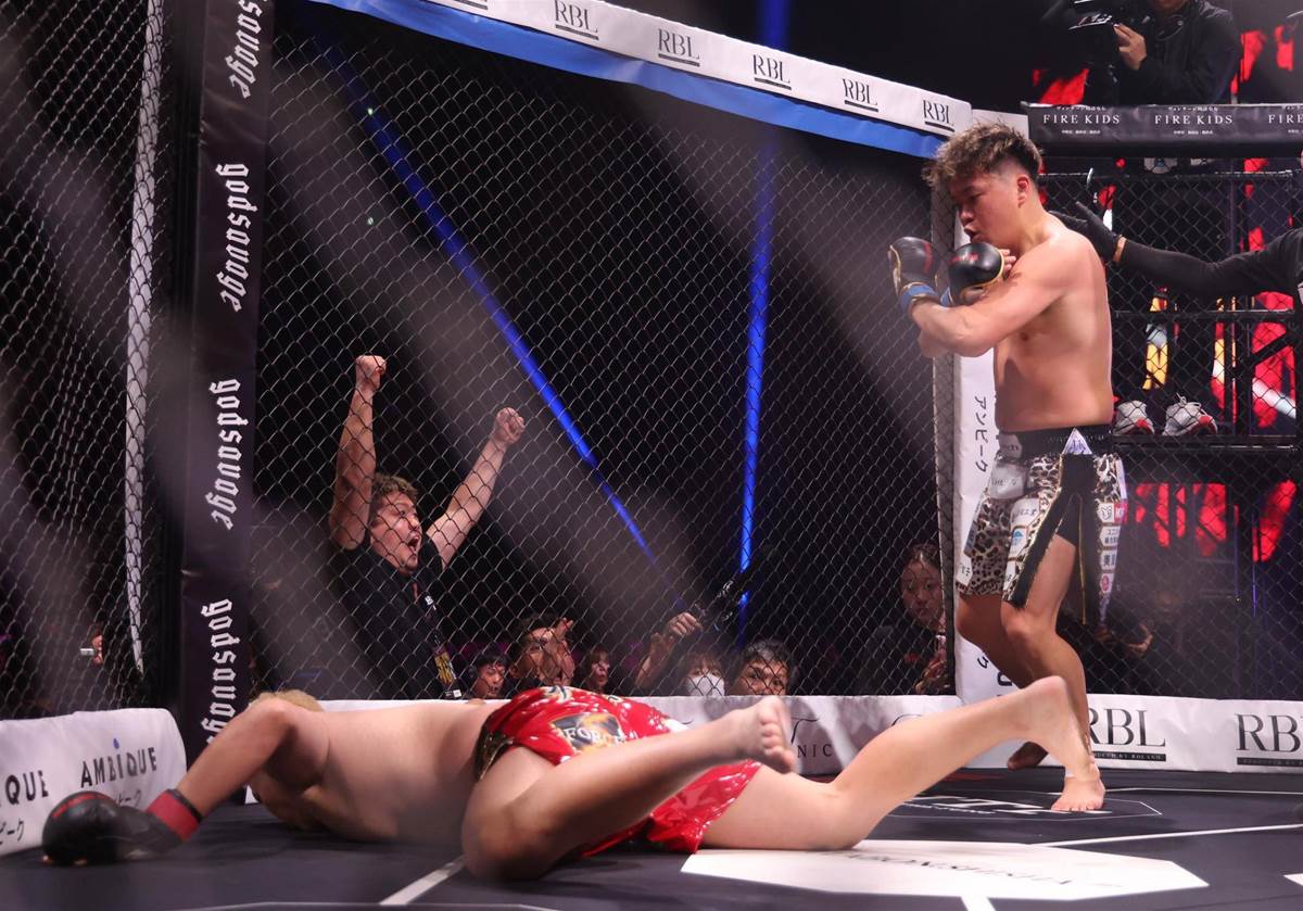 試合中、寿希也の左フックが川島の顎に直撃し、彼は前のめりに倒れ、立ち上がったものの足元がおぼつかず、レフェリーが試合を止めました。川島の連勝はここで4でストップし、会場は騒然となりました。