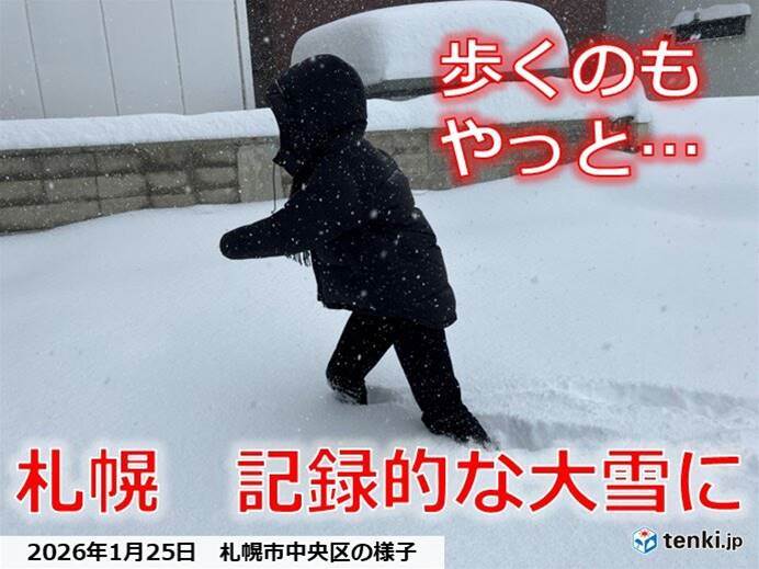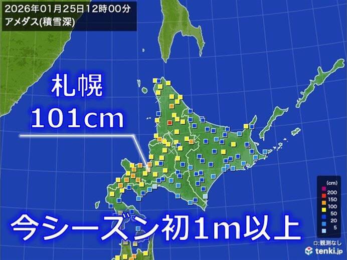 札幌で4シーズンぶりに積雪が1メートルを超える記録的な大雪となりました。今日(25日)未明から雪が強まり、午前11時までの12時間で38センチの降雪が観測されました。この数値は2000年以降の統計で1月としては最多で、正午には積雪が101センチに達しました。石狩湾周辺の地域では、大雪が少なくとも夕方まで続くと予測され、交通障害も拡大する恐れがあるため警戒が必要です。すでにJRの運休・遅延、高速道路の通行止め、空の便への影響も報告されています。夜には降雪が弱まる見通しですが、明日以降も雪山の影響で見通しの悪い状態が続き、注意が必要です。