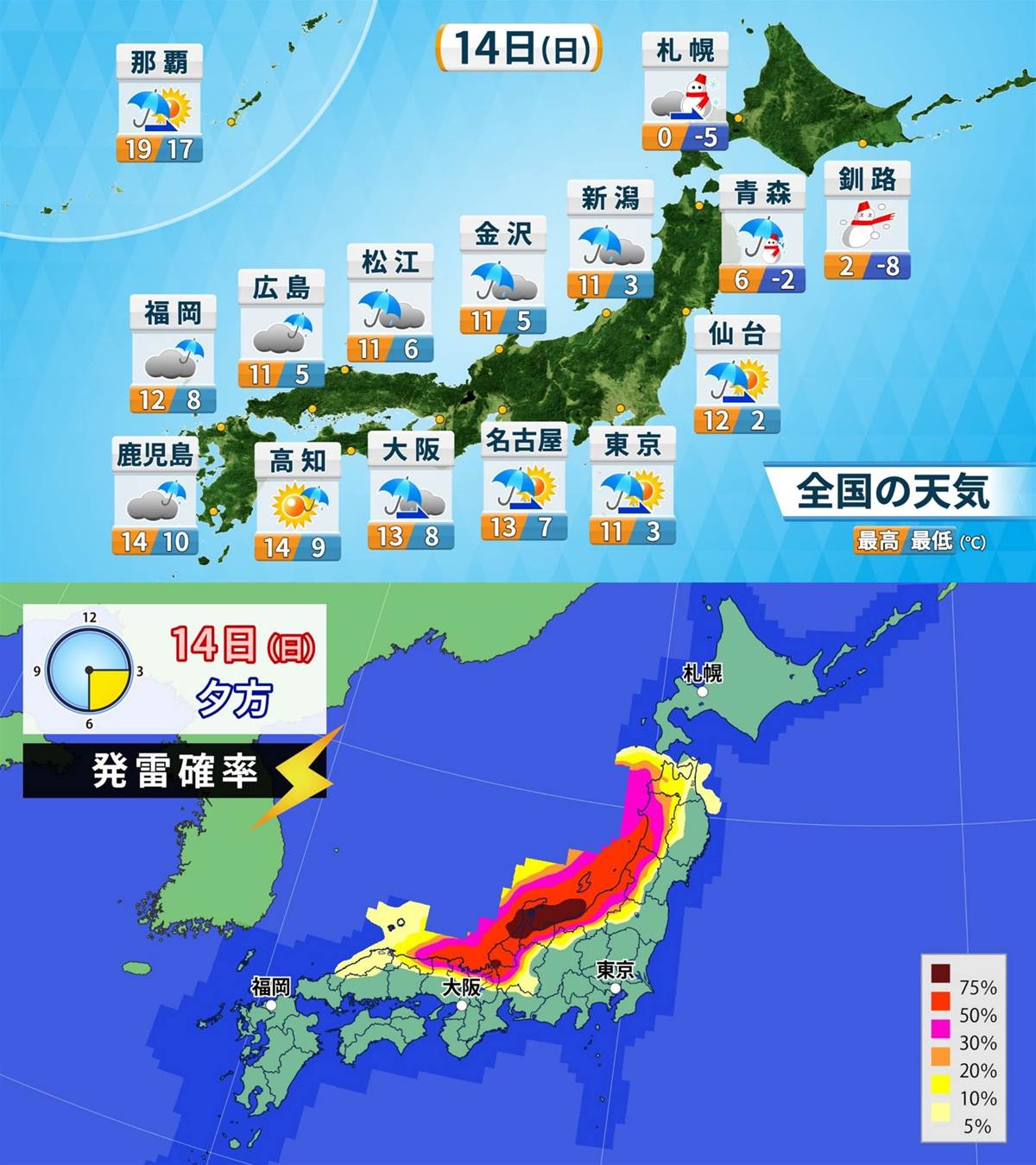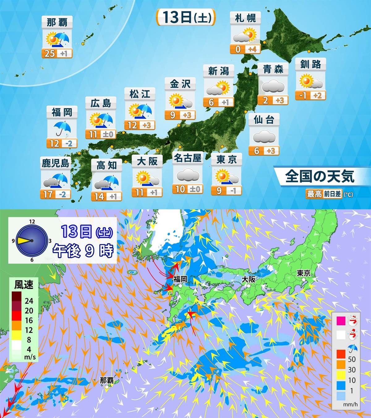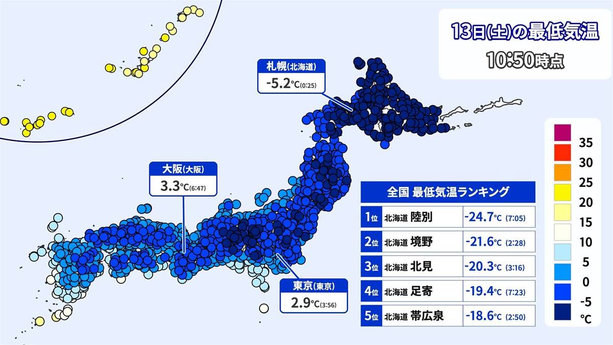 11月13日(土)、日本の東から北にかけて真冬並みの寒さが予想され、東京都心でも最高気温が9℃となり、本シーズンで最も寒い日となりそう。午前中に全国約558地点で0℃未満の冬日が観測され、北海道の陸別では-24.7℃の今シーズン全国最低気温を記録。午後には天気が下り坂になり、東から北日本は翌14日(日)および週明け15日(月)にかけて雨や雪が降り、大荒れの天気に。