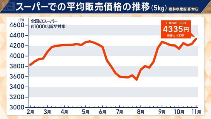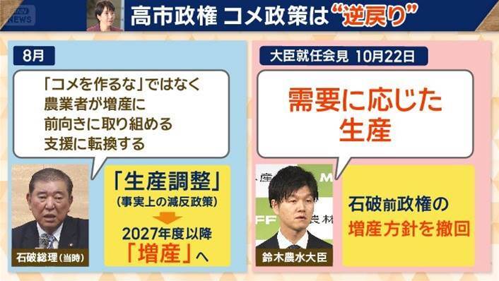 また、コメの平均販売価格が最高値を更新する一方で、価格暴落の懸念も出ています。高市政権が石破政権の増産方針を撤回し、需要に応じた生産に戻したことで、現場に混乱が生じており、農水省は来年の主食用米生産量を減らす方針です。この状況で、米政策の不安定さが指摘されています。