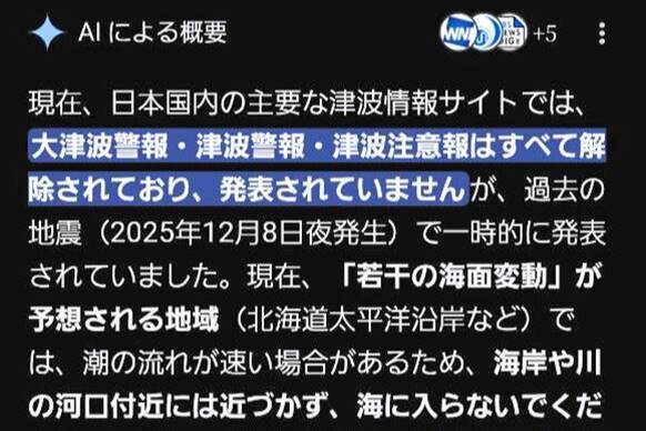 8日深夜、青森県東方沖で地震が発生し、最大震度6強を記録した。気象庁は北海道、青森県、岩手県に津波警報、宮城県、福島県に津波注意報を発表した。その後、警報は午前2時45分に注意報へ、午前6時20分に解除された。しかし、9日午前2時10分頃、グーグル検索でAIが誤情報を表示する問題が発生。警報が出ているにも関わらず解除されたと誤った回答がされ、問題が繰り返された。