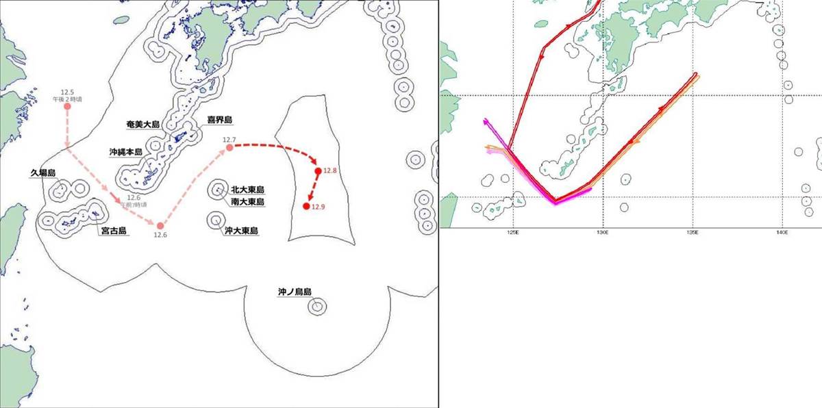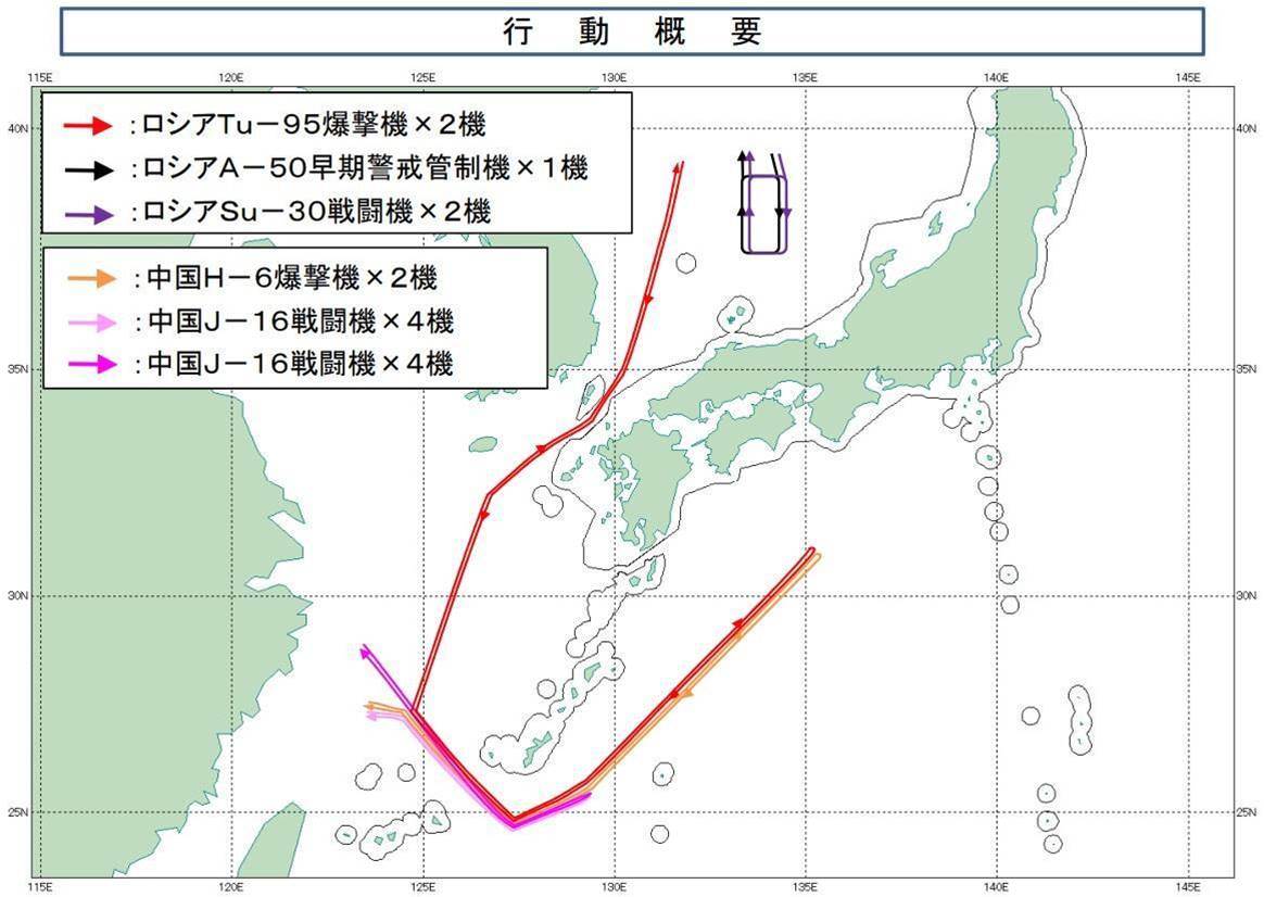 ロシアのTu-95爆撃機、中国のH-6爆撃機各2機が、四国沖に進出、一部は沖縄本島沖まで護衛されました。また、ロシアのA-50早期警戒管制機なども隠岐諸島沖まで飛行し、情報収集を行ったと考えられます。