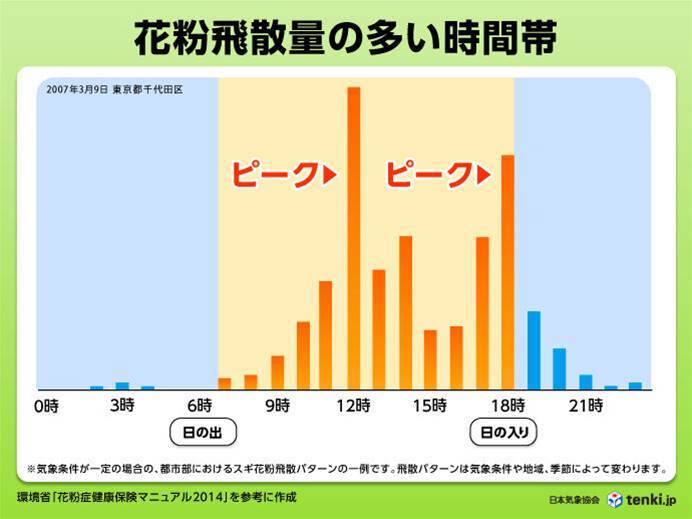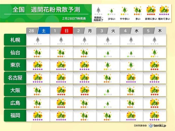 東京都心では、スギ花粉の飛散がピークを迎え、特に気象条件が揃った2月28日には大量飛散が予測されています。同日には、1平方センチメートルあたり100個以上の花粉が飛散し、東京都内で「花粉光環」が観測されました。2月13日には花粉の飛散が始まり、ピークは3月上旬から中旬にかけて続くと予想されています。3月1日には関東から九州にかけて「極めて多い」飛散が予測され、ピークの期間は10日から1か月程続きます。花粉対策として、玄関先で服や髪についた花粉を落とし、窓を閉めたり、部屋干しをすることが推奨されます。