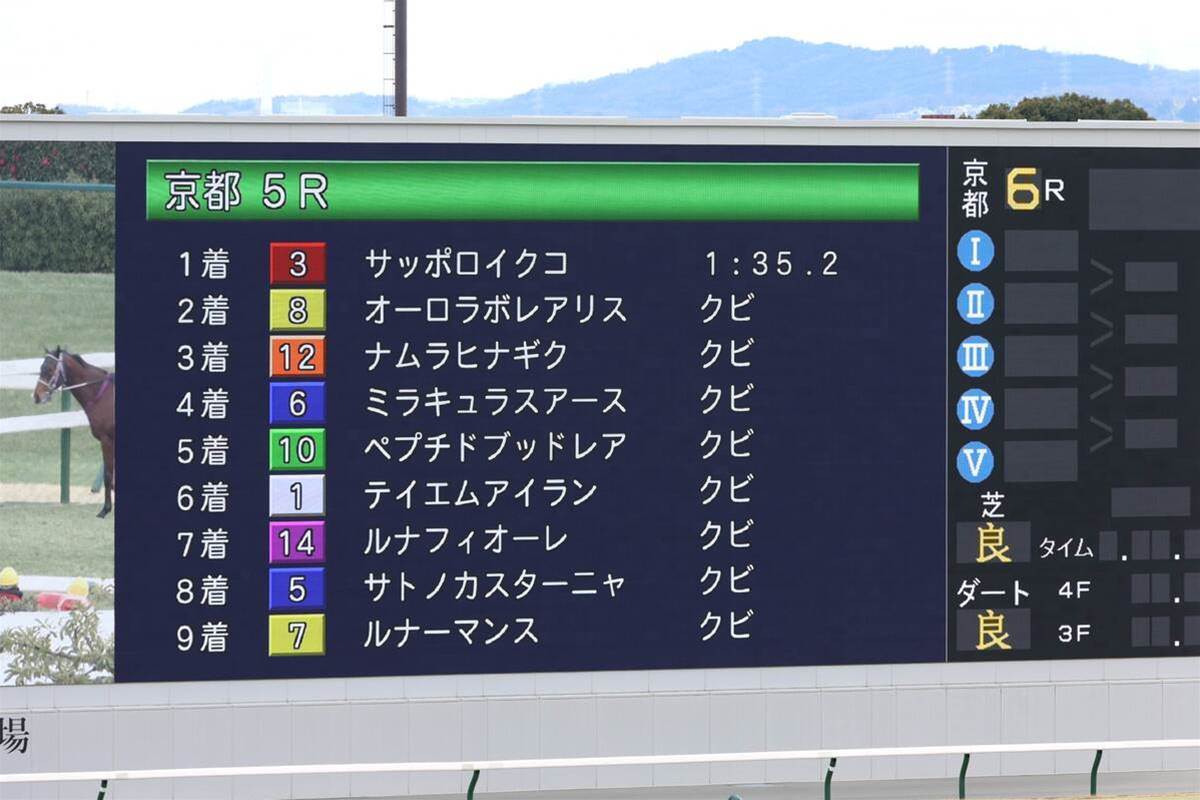 2月7日の京都競馬5R・3歳未勝利戦(芝1600メートル、14頭立て)で極めて珍しい事象が発生。勝った馬サッポロイクコから9着馬ルナーマンスまでの着差がすべて「クビ差」となり、ターフビジョンの情報表示に「クビ」の文字が並ぶ異例の展開となった。勝ち馬と9着馬の間にはタイム差0.4秒。注目された大混戦で、出走馬の人気分布ではトップの単勝5.4倍から10頭が単勝20倍以内という拮抗した状況だった。過去にも2017年の安田記念で同様の事象があったものの、9頭もの着順に付いた例は極めて稀。SNS上ではこの珍事に驚きと笑いの声が広がった。