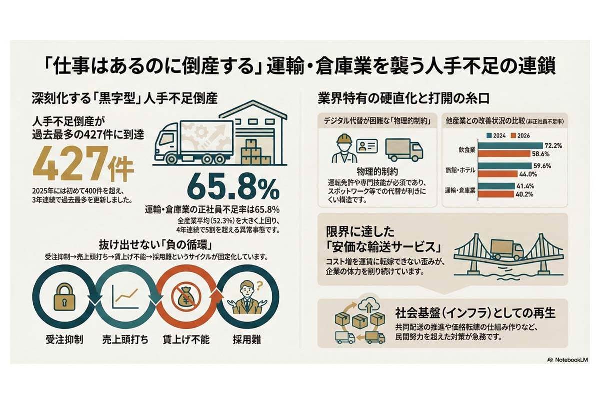 2026年現在、日本の経済は一見堅調に見える一方で、黒字にもかかわらず倒産する企業が続出する異常事態に直面しています。特に運輸・倉庫業界は深刻で、産業全体では正社員の不足率が65.8%、非正社員でも40.2%が不足するという厳しい状況です。2025年には人手不足が原因で427件もの倒産が発生し、これは3年連続で過去最多を更新する数字です。経営者たちは人員不足による受注の制限を余儀なくされ、売上が伸び悩み、賃金の引き上げも叶わない状態に陥っています。この悪循環は企業の体力を消耗させ、やがて黒字倒産を招く結果につながっています。