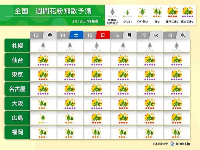 スギ花粉のピークを迎え、地域による飛散量の差が大きい中、特に東海、関東、東北で大量飛散が続いています。ピークは3月中旬から下旬であり、西日本でも14日以降飛散量が増加する見込みです。また、ヒノキ花粉の飛散も始まり、4月にかけてピークを迎えます。特に東日本と北日本では例年より花粉飛散量が多い予測で、東京都内でも地域差があり、多摩地方では予測量を超えており、対策の重要性が増しています。マスクや薬、花粉対策グッズを備えることが求められます。