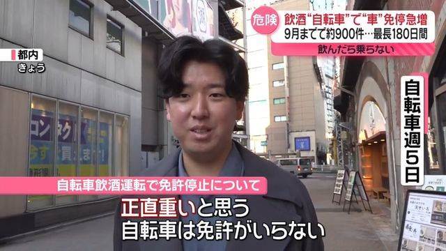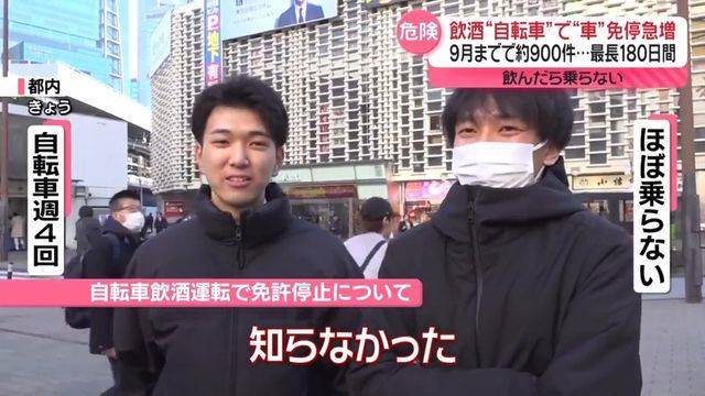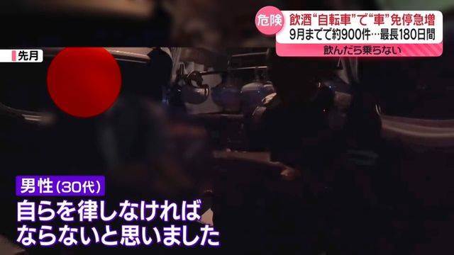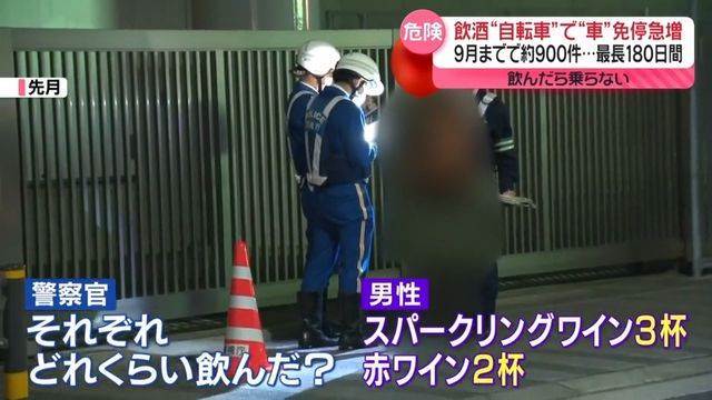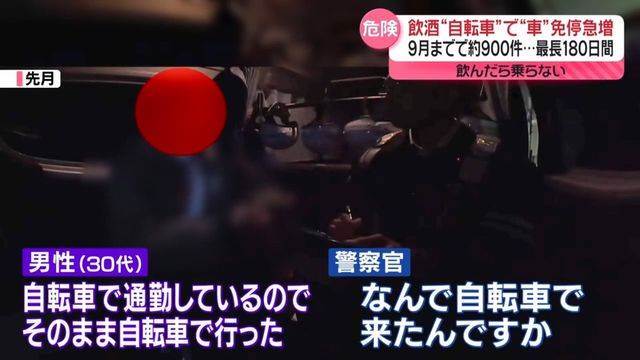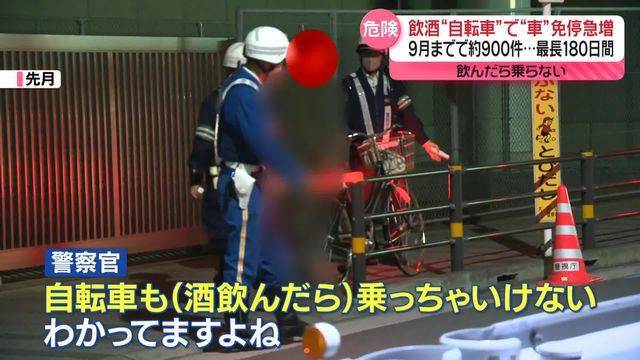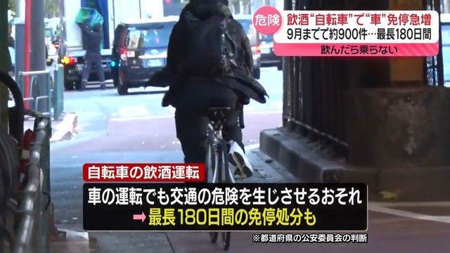 自転車の飲酒運転が原因で自動車の免許停止処分を受けるケースが急増しています。今年、忘年会シーズンを迎え、警視庁は飲酒運転への取り締まりを強化しています。昨年の自転車飲酒運転による免停処分は23件でしたが、今年は9月までに896件に達しました。罰則は「3年以下の拘禁刑、または50万円以下の罰金」と、車と同じです。取り締まりを受けた男性は、会社の懇親会の帰りに飲酒し、自転車に乗っていたところ、酒気帯びの基準値を超える状態で摘発されました。