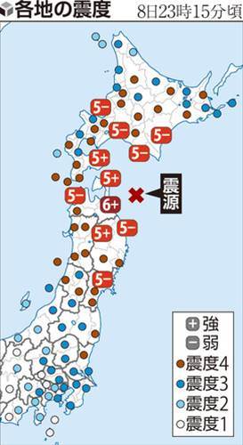 青森県では国道394号で路面が陥没し、1台の車と男性が巻き込まれ負傷した。約1365戸が断水するも、ほぼ復旧。また、小中高校315校が休校。使用済み核燃料プールの水がこぼれたが、安全には影響なし。