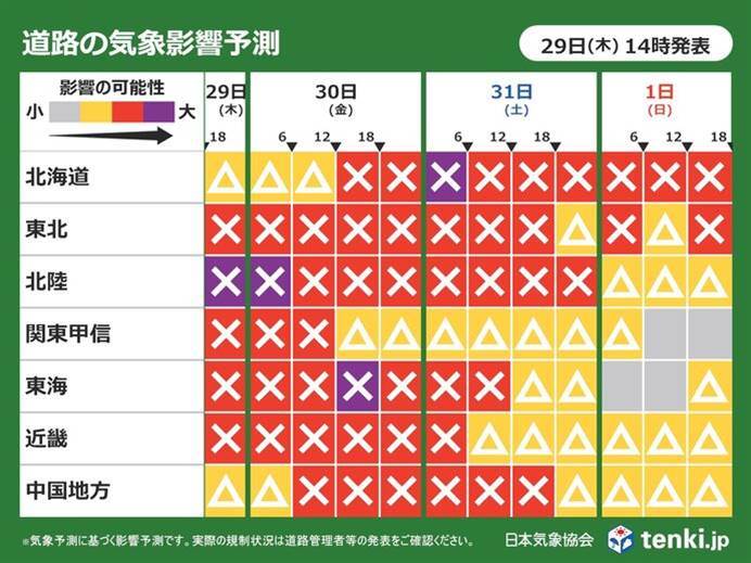 日本付近は今夜から明日にかけて冬型の気圧配置が強まり、日本海側を中心に大雪が降る見込みです。特に北陸地方では、29日夜から30日明け方にかけて最も大きな影響が出ると予測されています。東海地方では30日、北海道日本海側では31日未明からさらに天候が悪化する可能性があります。道路は積雪や凍結による高速道路の通行止めや速度規制が行われる恐れがあり、交通事故のリスクも高まる状況です。雪装備の不備による立往生を防ぐため、スノータイヤやチェーンの準備が必須です。特定の気圧配置「日本海寒帯気団収束帯(JPCZ)」が大雪をもたらしており、通常雪が少ない地域でも交通網に重大な影響を及ぼすことが懸念されています。