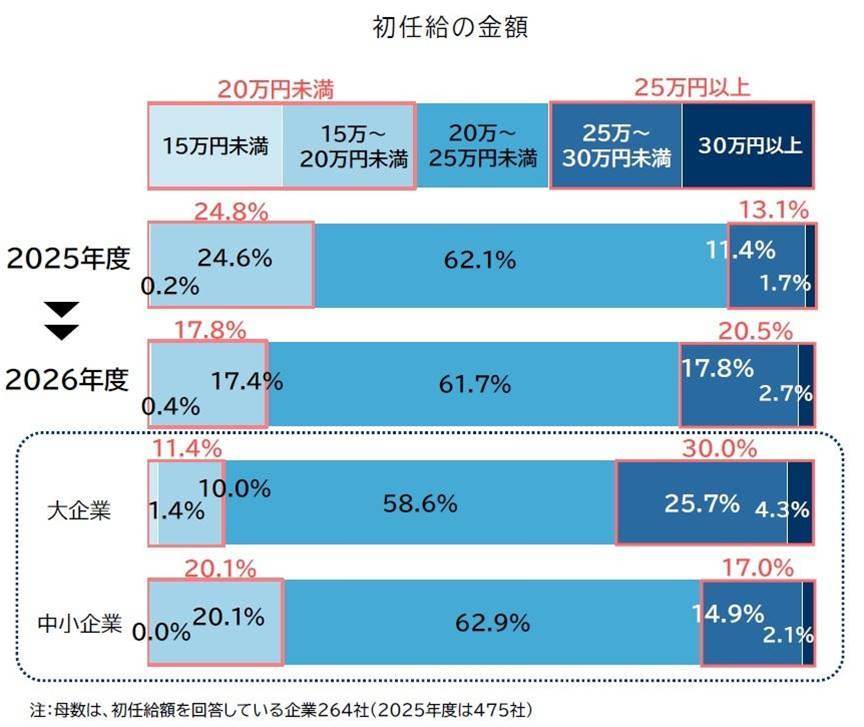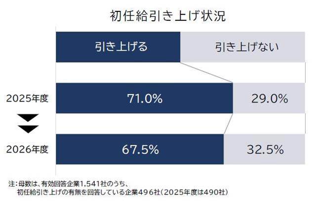 2026年4月入社の新卒社員に対する初任給について、調査回答企業の67.5%が引き上げを行うと明らかにした。これは前年度比3.5ポイント低下したものの、全体の7割近くとなる。一方、初任給を据え置く企業が32.5%に上昇。引き上げ理由としては人材確保やインフレ対策の必要性が挙げられた。しかし、物価高騰や収益の伸び悩みを背景に、中小・小規模企業では対応が困難な実態も浮き彫りに。引き上げ額は「1万~2万円未満」が最多で平均9,462円だったが、企業規模ごとの格差が依然として存在している。大企業では「25万円以上」の初任給支給割合が30.0%に達する一方、中小企業は17.0%にとどまり、特に中小企業は既存社員との「逆転現象」への懸念や原資確保の困難さが課題として指摘された。