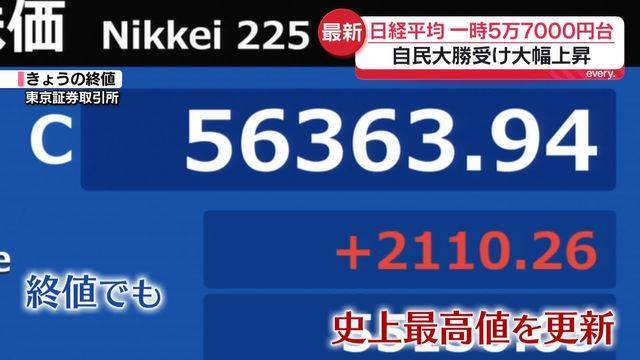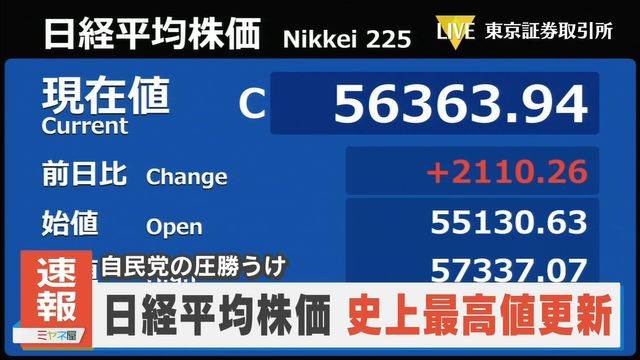 衆議院選挙で自民党が3分の2以上の議席を獲得し、高市政権の政策推進力が強まる見込みが示される中、東京株式市場では日経平均株価が大幅に上昇しました。一時は3000円を超える上昇幅を記録し、終値は5万6363円と史上最高値を更新しました。背景には、政府の積極財政による企業利益拡大への期待と海外投資家による「日本買い」の動きが加速したことが挙げられます。ただし、市場関係者の間では、こうした財政政策を実行するための明確な財源の提示が今後のポイントとなると指摘されています。