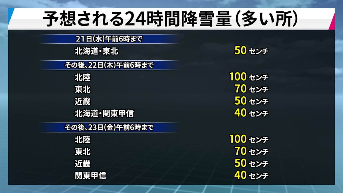 日本付近では、21日(水)から25日(日)にかけて強い冬型の気圧配置が続き、北日本から西日本の地域では日本海側を中心に大雪が予想されています。特に山沿いや山地のみならず、平地でも短時間で降雪が急増する恐れがあり、普段雪の少ない太平洋側ですら大雪となる可能性があります。急速に発達する低気圧が日本の東から進むことで、日本海側に形成される別の低気圧も南下し、北日本に影響を与える見込みです。北海道をはじめとする地域では22日以降も気温が著しく低下し、交通障害や路面の凍結、着雪やなだれに注意・警戒が求められます。結果として、積雪がさらに増加し、広範囲での影響が懸念されます。