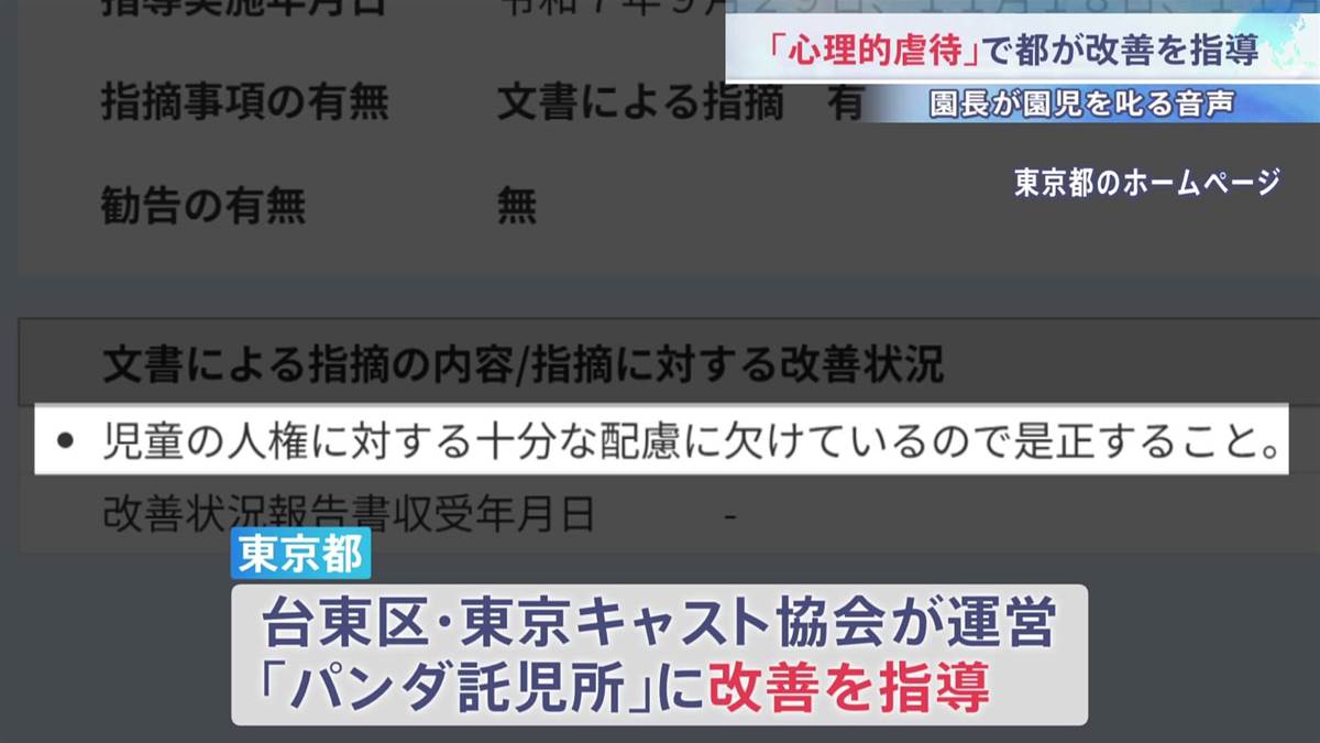 昨年11月、東京都内の保育園で、園長が園児に対して威圧的に叱責する行為が報道されました。この「パンダ託児所」に関して、東京都は園長の行為を「心理的虐待」と判断し、改善指導を行いました。当初は通報にもかかわらず問題が確認できなかったものの、音声データの提出を受けて特別立入調査を実施し、園長の不適切な言動が確認されました。改善指導の内容には、謝罪や外部専門家による検証が含まれています。園は園長に戒告処分を行い、子どもの人権尊重を掲げた保育改善を約束しています。
