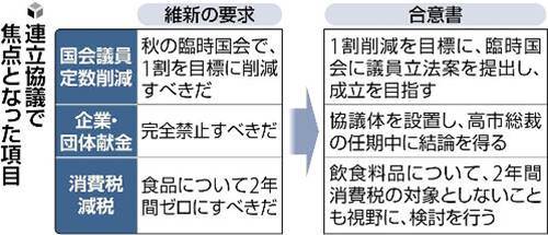 自民党と日本維新の会は、連立政権の合意書において、議員定数の1割削減を「目指す」とし、企業・団体献金の完全禁止と消費税減税については「検討」として、慎重論を残しました。議員定数削減に関しては、比例選を重視する公明党への配慮が必要との意見がありました。企業献金に関して、自民は透明性を重視し、結論を2027年まで先送りしました。