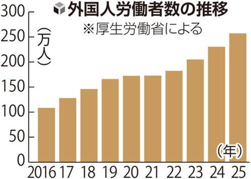 国内で働く外国人労働者が過去最多を記録。昨年10月末時点で257万1037人と、前年同期比で26万8450人増加した。ベトナム出身者が最も多く、全体の約23.6%を占める。技能実習や特定技能の在留資格で働く人々も増加しており、外国人労働者を雇用する事業所数は37万1215か所と最多に達した。主に従業員30人未満の小規模事業所で、平均雇用人数は6.9人。