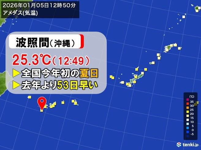 沖縄県波照間島では、1月5日、全国で今年初となる夏日が観測されました。この日は二十四節気の「小寒」で、通常は寒さが増す時期ですが、八重山地方は高気圧に覆われて晴れ、日差しが強まって気温が上昇しました。その結果、波照間島では最高気温が25℃以上を記録し、平成以降で最も遅かった昨年に比べて53日も早い観測となりました。