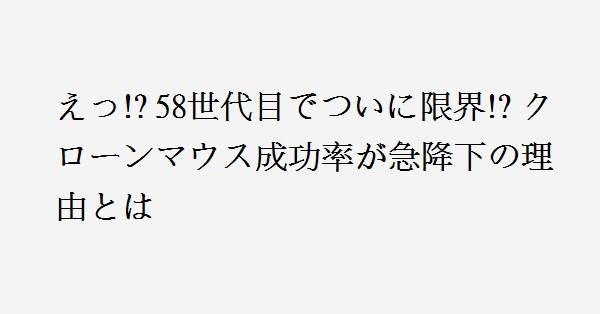 3、面白い研究ですね。なぜ同じ個体のはずのクローンで突然変異が増えるんでしょうね、不思議です。クローンを作る過程で遺伝子に傷なのか何かの支障が起きてしまうんですかね。なぜ多世代クローンで異常が起きるのかの原因がぜひ知りたいです。