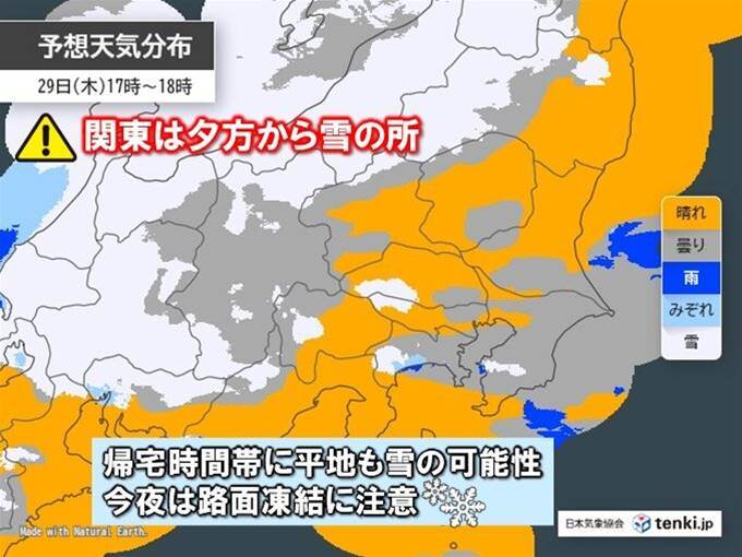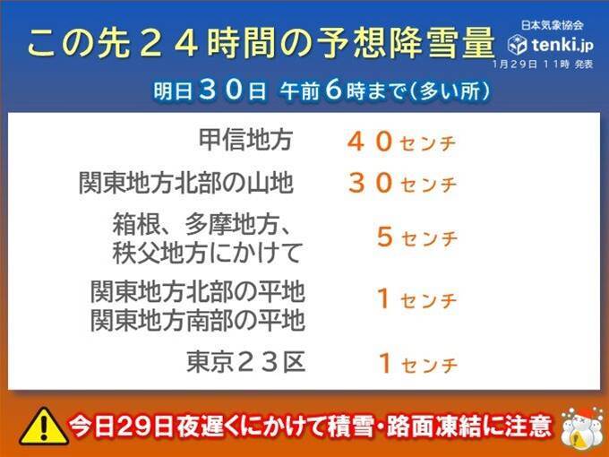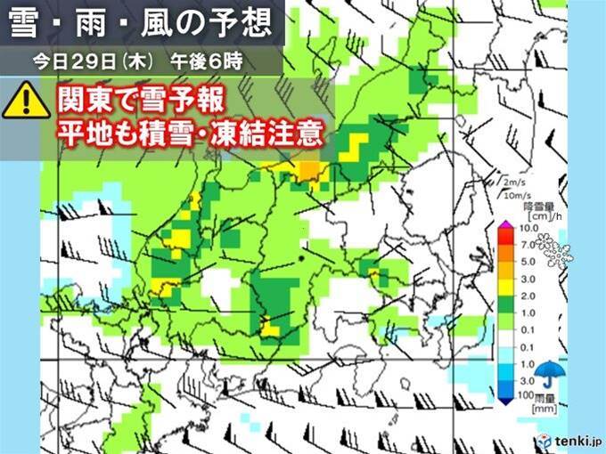 今日29日は関東地方において、西高東低の冬型気圧配置が影響し、上空5500メートルで氷点下33度以下の寒気が流れ込んでいる状況です。午後から夜にかけては、箱根、多摩、秩父などの内陸部で雪が強まり、最大で30センチの積雪が予想されます。また、東京23区など平野部でも一時的に雪や雨が降り、局地的な積雪や交通障害の可能性が指摘されています。特に夜間は気温の低下に伴い路面の凍結が進むため、大気の不安定な状態と併せて注意が必要です。