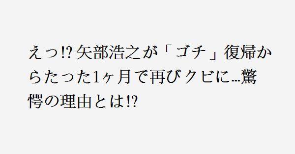 2023年12月25日、日本テレビ系「ぐるぐるナインティナイン」の「ゴチになります」最終戦で、矢部浩之がクビになった。番組は東京・池袋のホテルメトロポリタンで行われ、高額設定金額のフレンチバトルの中、矢部は最下位でクビが決定。復帰から1か月での再びのクビとなり、「まだ状況を飲み込めてません」と呆然としていた。今回のクビ人数は最大3人というルールに基づき、小芝風花と高橋文哉もクビに。