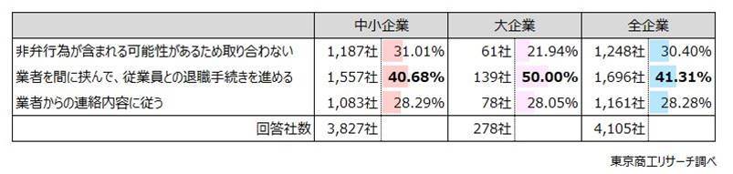 事件概要:2026年3月、退職代行業者による弁護士法違反の疑いが浮上し、関連する実態調査が行われた。総回答数6,425社のうち、8.7%が退職代行サービスの利用経験があると回答。利用者が多い業種は宿泊業(24.1%)が最多だった。企業側の対応として「業者との手続きを進める」が41.3%に上る一方、「非弁行為が含まれる可能性があるため取り合わない」企業も30.4%を占めた。また、退職代行利用歴のある求職者に対し、49.3%が採用に慎重になる意向を示している。この状況を背景に、退職代行業者への法的規制と信頼性への懸念が拡大している。