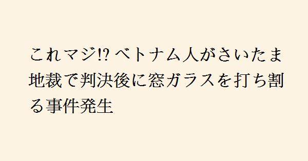 さいたま地裁での判決後、被告が窓ガラスを割り逃亡を試みた事件では、出入国管理及び難民認定法違反や窃盗の罪で懲役6年を言い渡されたチャン・ドゥック・ルオン被告が法廷で暴れた。17日午後4時15分からの裁判で、山梨、新潟、長野など8か所で52台の車と現金約467万円を盗んだとされる。ルオン被告は、判決に不服がある場合の控訴の旨が伝えられた直後に、窓ガラスを破壊。