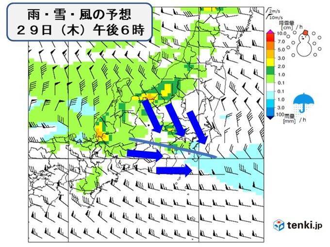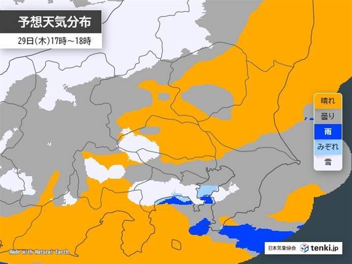 明日29日(木)の午後、関東の南部では冬型の気圧配置による寒気の影響で雪や雨が予想されています。神奈川県や千葉県、特に東京の多摩地域や23区でも一部で雪が降る見込みです。積雪は道路に影響を与えるほどではないとされていますが、足元や車の運転には注意が必要です。平地や建物の屋根などがうっすら白くなる可能性もあります。特に雪道を歩く際は、橋の上や横断歩道、乗り降りの場所、地下の入り口などが滑りやすくなるので注意を払い、安全に過ごすための準備をしてください。標高の高い地域では積雪が予想されますのでさらに注意が必要です。
