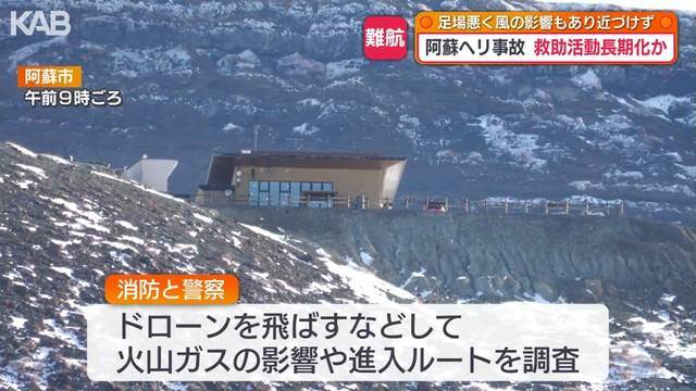阿蘇中岳火口でのヘリコプター事故を巡り、現地の救助活動は困難を極めています。1月20日に遊覧飛行中のヘリが消息を絶ち、現場は火山ガスや危険な地形に阻まれ、物理的な接近が困難です。26日時点で警察や消防がドローンを用いて調査を進める一方で、近づけるルートの選定が難航しています。ヘリには3人が乗っていたものの安否は依然不明で、救助活動は数カ月規模での長期化が見込まれるとのことです。