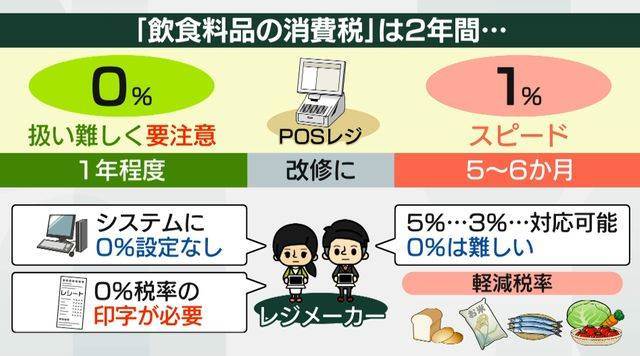 2、「ゼロ」%では技術的にダメだ、という理由が分かりません。少し前に「コンピューターはゼロで除算するとエラーになるから」と書いた記事がありましたが、極めて怪しい。税率0なら「販売価格が元の定価の1.0倍」になるだけで、計算上の技術的影響は出ないのでは。 1989年に消費税を初めて導入したときも、レジやPOSシステムの改修は数カ月で済みました。その後何度も税率を変更して、業界が改修に慣れた今、税率をゼロに戻すのに、最初の導入時よりも時間がかかるとは不自然です。