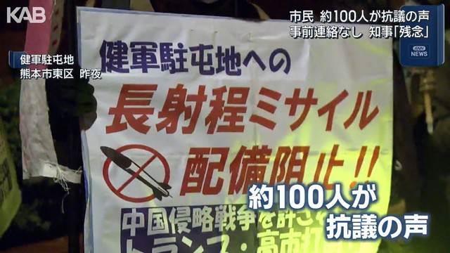 長射程ミサイルの発射機を載せた車両が熊本市の健軍駐屯地に搬入されたことをめぐり、木村敬知事は9日、搬入に関する事前連絡がなく、報道を通じて知ることになった点が「残念」と述べました。健軍駐屯地前では、住民約100人が集まり、説明会がなかったことや事前連絡の欠如への抗議が行われています。防衛省側は部隊運用に関する詳細は差し控える方針を示しながらも、装備品展示会の意向を県側に伝えた模様です。知事は、小泉防衛大臣の発言を引用し、配備に関する事前説明を期待していたものの、一連の流れに疑問を呈しました。