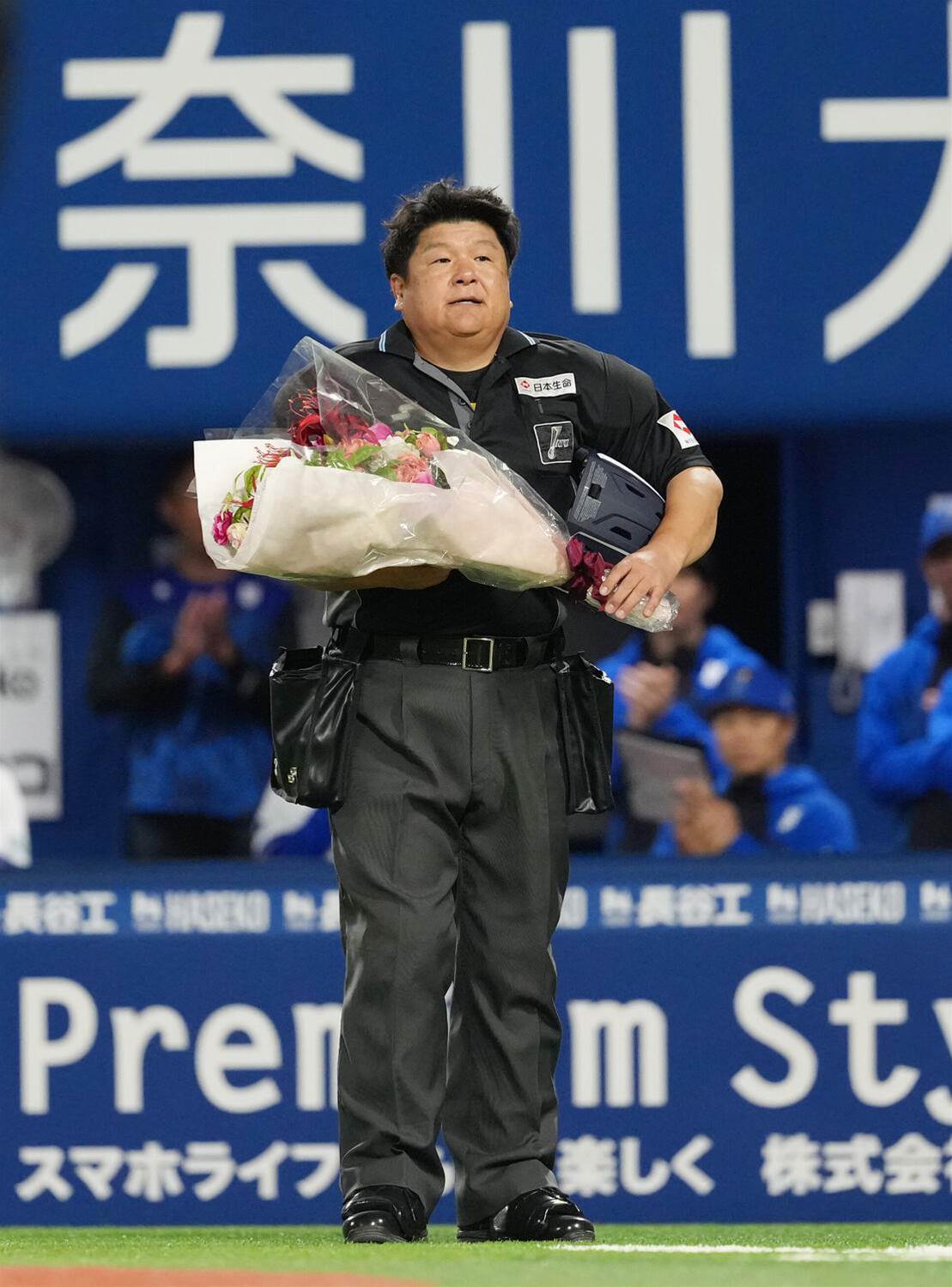 事件概要:2023年10月24日、横浜で行われたプロ野球の試合「DeNA-巨人」で、審判員の敷田直人氏が通算2000試合出場を達成し、その業績が祝福された。敷田氏は「卍ポーズ」で有名な審判員であり、試合の5回終了後、メインビジョンに祝福のメッセージが映し出された。観客の温かい拍手の中、敷田氏は花束を受け取り、サービスとしてトレードマークの「卍ポーズ」を披露。場内では歓声とどよめきが広がり、観客からの声援が送られた。