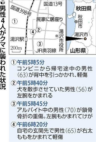 秋田県湯沢市では20日朝、JR湯沢駅周辺で4人の男性が連続してクマに襲われ、うち1人が重傷を負い、3人が軽傷を負いました。最初の襲撃は午前5時5分頃、市道で起こり、続いて国道13号やホテル駐車場、民家の玄関先で発生しました。被害者はそれぞれクマに引っかかれたり噛まれたりし、鎖骨が折れるなどの重傷を含む怪我を負いました。事件当日の午後11時現在、クマは民家に居座り続けており、箱わなを使った捕獲も難航している状況です。