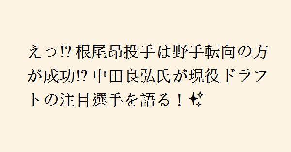 今年で4回目を迎える現役ドラフトが9日に行われる。過去のドラフトでは、移籍後に活躍を見せた選手が多数存在し、例えば第1回の細川成也外野手は3年連続で20本塁打、第2回の水谷瞬外野手は打率.283、21本塁打を達成した。阪神OBの中田良弘氏は中日の根尾昂投手に注目。投手としての成績は芳しくないが、再び野手としての挑戦を提案。
