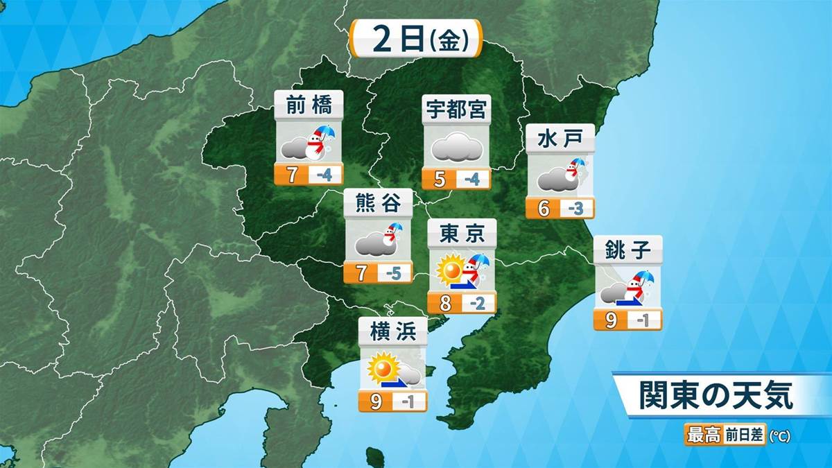 注意点: 特に路面の凍結による交通障害への警戒が必要です。気温は関東北部で6℃前後、東京南部で8℃前後と低く、午後から夜にかけて防寒対策が不可欠です。