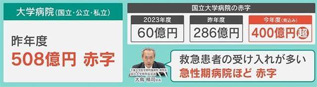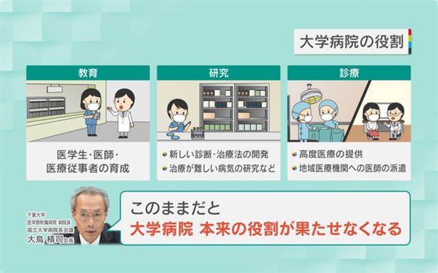 国立大学病院も法人化されているため、独立採算で赤字に対応せざるを得ない状況です。2024年度の大学病院全体の赤字は508億円に達すると予測され、国からの運営費交付金も不十分であるため、若手医師の育成や高度医療の提供といった大学病院の本来の役割が危ぶまれています。