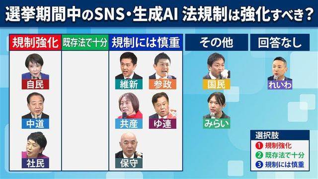 SNS時代の選挙でフェイク情報が飛び交う現状は、まさに異常事態です。特にAI生成による偽情報が簡単に拡散される中、各政党の対策にもはや待ったなしの状態と言えます。多くの政党が法的措置を求めている一方で、規制の強化は慎重に進めるべきだという声も聞かれます。