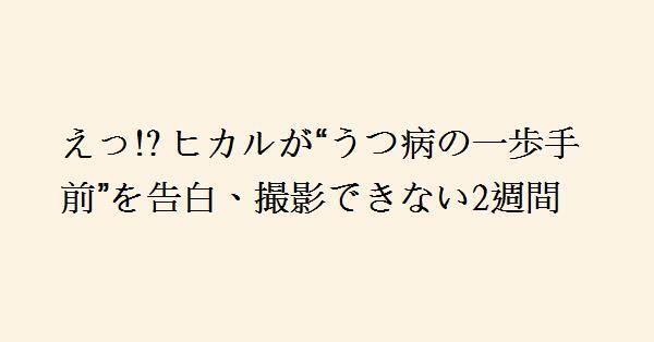 3、>「うつ病の一歩手前と言われました」というタイトルで動画を公開した。「最近、本当に撮影したいっていう気持ちが全く起きてなくて、この2週間ずっと撮影なしで過ごしてました社会人も会社に行きたくない時もあるし、学校だって行きたくない時もある。これが全てうつ病になるならほとんどの人がうつ病だと思うよ。人間誰しもそんな時があるよ。別に決まった時間に出勤して…とかじゃないなら休みたければ休めばいいだけ。彼みたいに饒舌に話せる人だったら人生楽しいんだろうなって思うよ。