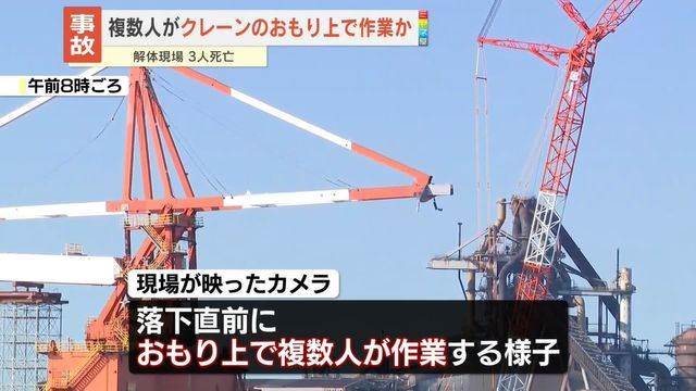 神奈川県川崎市の「JFEスチール東日本製鉄所」で7日午後、高さ40メートルのクレーンの解体工事中に足場が崩壊する事故が発生しました。この事故で作業員5人が転落し、うち小池湧さん、千葉ケン志朗さん、上山勝己さんの3人が死亡しました。クレーンのおもり(重さ約500トン)が落下する瞬間、複数の作業員がその上で作業をしていたことがカメラの映像から判明しています。さらに、1人の行方が依然として分からず、巡回船などによる捜索が継続されています。