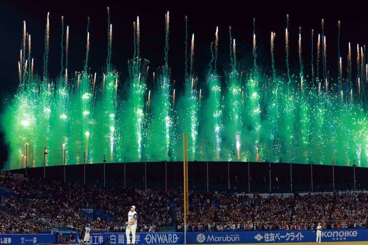 10月19日、神宮球場で行われたセ・リーグのヤクルト対巨人戦は、九回表2死一塁の場面で、国立競技場で開催されていたMrs. GREEN APPLEのライブに伴う花火が打ち上がり、一時試合が中断する事態が発生した。この日は七回裏にも同様に中断しており、これでMLBスタジアムからのイベントによる影響が2度目となった。なお、前日18日にも同様の花火による試合中断が発生しており、その際はヤクルトの攻撃中にサヨナラ勝ち。しかし今回の中断は、攻撃中の巨人にアドバンテージが与えられる可能性もあったが、最終的にヤクルトが3-1で勝利した。