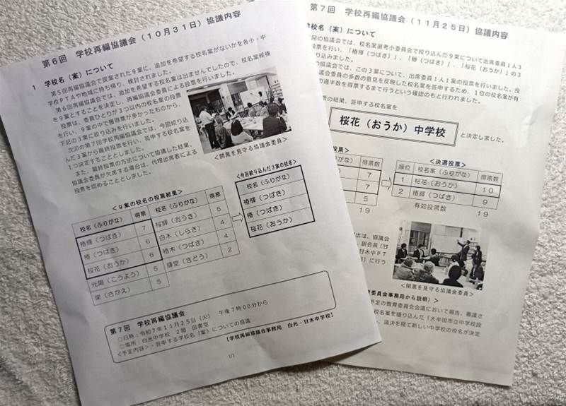 3、学校内での話し合いに対して、外部団体からの干渉とか、どうなん。(´・ω・`)>白光中(同市椿黒町)と甘木中(同市甘木)が統合される。両校長やPTAらでつくる学校再編協議会が9月に生徒や住民らから案を募り、寄せられた340件について議論と投票を重ねて決めた。当該校の生徒2人による案と言い、「桜のように生徒が個性を輝かせ、充実した学校生活を送ってほしい」と思いを込めた。