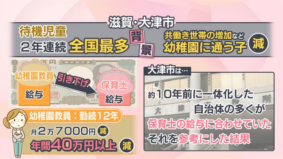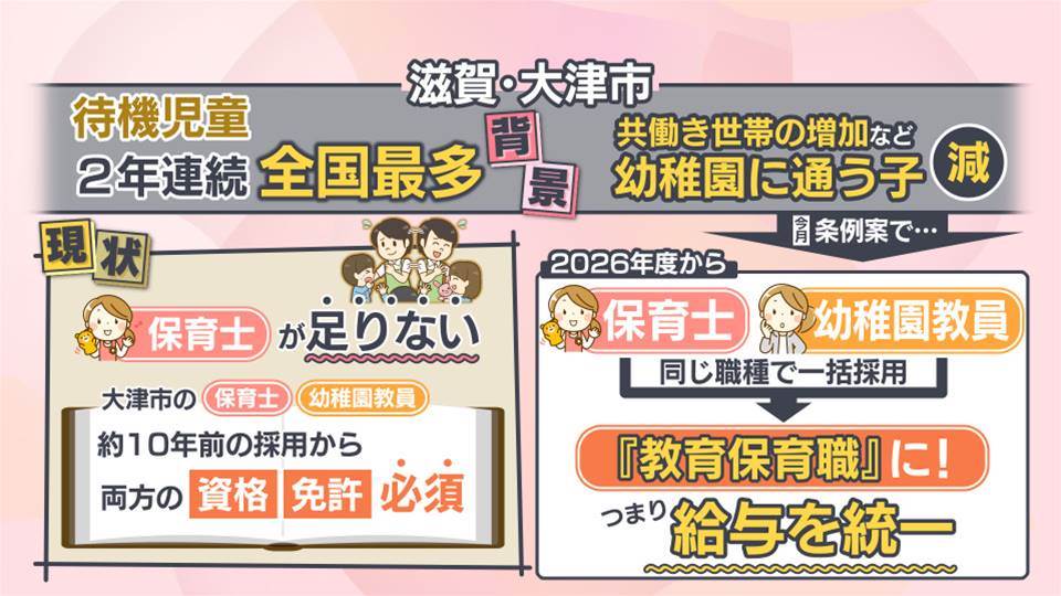 大津市では待機児童問題の解決策として、幼稚園教員と保育士の職種を一本化し、給与を統一する条例案が提出されました。しかし、統一後の給与水準は保育士に合わせられ、幼稚園教員の賃金が月約1万4000円、年収で40万円以上も減少する見込みです。現場からは「やる気が削がれる」という懸念が広がり、幼児教育の質低下も心配されています。市は幼稚園児の減少や全国的な事例を参考にしたと説明しましたが、市民や教職員団体からは、「給与を低い方に合わせる判断」の疑問が多く寄せられています。