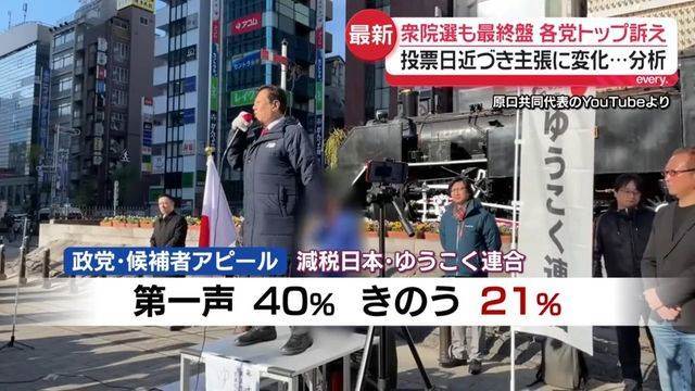 今回の衆議院選挙に向けた各党の演説は、初日と最終盤を迎えた状況で比較され、各党の訴えに変化が見られました。自民党の高市早苗総裁は経済・成長戦略に重きを置き、維新の吉村洋文代表は地元大阪の実績を強調しました。野田佳彦共同代表は「とっとと決めることが民主主義ではない」と批判的な視点を示し、国民民主党の玉木雄一郎代表は社会保障や「年収の壁引き上げ」を訴えました。さらに、日本保守党の百田尚樹代表や社民党の福島瑞穂党首は外国人政策や憲法改正といったテーマに強く言及しました。選挙戦も最終盤に差し掛かり、投票日まであと2日です。