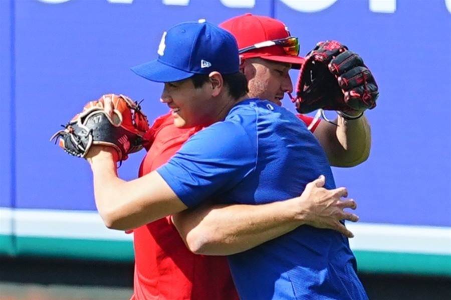 大谷翔平選手がドジャース所属として古巣エンゼルスとのオープン戦に出場した日本時間23日、試合前に元チームメイトのマイク・トラウト外野手と再会し、笑顔でハグを交わした。大谷が右翼後方でキャッチボールをしていた際、中堅で球拾いをしていたトラウトが駆け寄り、盟友の絆が感じられる温かい瞬間となった。「トラウタニ」と称されるコンビでエンゼルスを支え続けた2人が再会を喜び合う姿は、多くのファンに笑顔を届けた。
