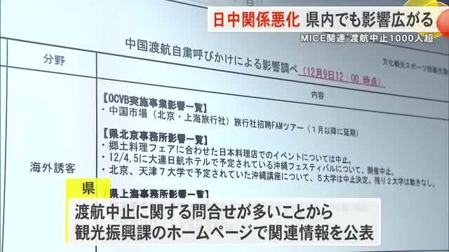 中国政府が日本への渡航自粛を呼びかけたことで、沖縄県においても多大な影響が広がっています。具体的には、那覇と上海を結ぶ中国東方航空の便が12月から2026年1月にかけて30便欠航することが決定されました。また、香港と石垣を結ぶクルーズ船の寄港が3件キャンセルされ、その理由は不明です。さらに、沖縄科学技術大学院大学(OIST)での国際会議に出席予定だった180人の研究者がウェブ参加に切り替えるなど、大規模な団体旅行も含めて1000人を超えるMICE関連での影響が出ています。